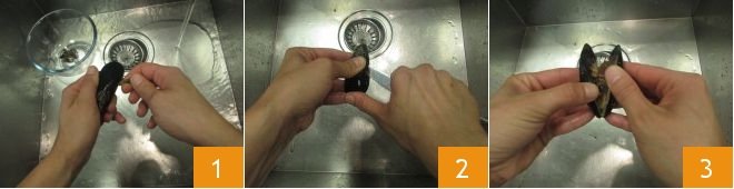 To make fried mussels, you first need to clean them. Once you have scrubbed the shells clean with a scouring pad and removed the beard inside1, open them while they are still raw. To do this, simply hold the mussel with your left hand, slide the blade of a small knife between both halves of the shell and push outward 2. Then separate the two halves of the shell, leaving them still attached 3.
