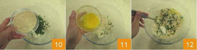Add another cup (40 g) or so of breadcrumbs 10 and the eggs 11. Blend everything until the mixture is uniform 12.