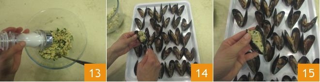 Season with salt and pepper 13 to taste. Now you need to fine-tune the consistency of the mixture by adding more breadcrumbs to compensate for the water released by the mussels until the consistency is dry and firm. Arrange the mussels on a tray and fill with approximately 1 teaspoon of the freshly prepared mixture 14, then pack the mixture down and re-close the shells slightly 15.