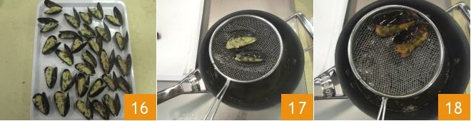When you have filled all the mussels 16, heat the oil to 340°F (170°C). When it is hot, submerge a few mussels at a time using a slotted spoon 17. Take great care because the oil may splash out at this stage. After about 3-4 minutes when the mussels are golden brown, remove them with the slotted spoon and drain them 18.