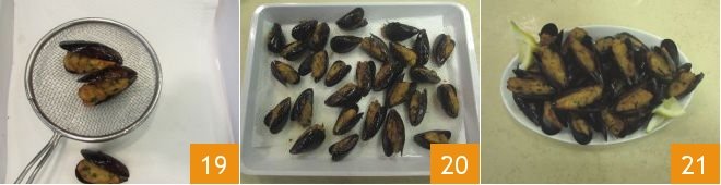 Transfer the mussels to a sheet of paper towel 19 and continue frying all the others 20. Serve your fried mussels while they are still hot 21!