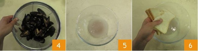 Put the opened mussels in a colander that you have placed over a bowl and carry on opening the other mussels 4. Now make the stuffing: set the colander containing the mussels to one side, then the the water released by the mussels 5 and add the coarsely crumbled bread 6.