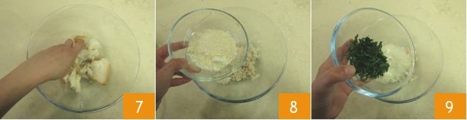 Knead everything together with your hands 7, then add the Parmigiano Reggiano DOP cheese 8 and the finely chopped parsley 9.
