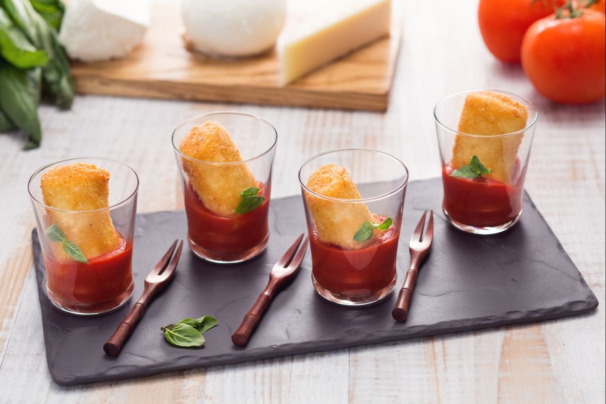 Excellent when served as finger food at a buffet or with drinks, fried paccheri will undoubtedly impress your guests. Simple to prepare, they draw inspiration from a Neapolitan recipe. In Naples, where they're known as schiaffoni, they are typically filled and fried, becoming a treat for the palate. Due to their large size and robust consistency, paccheri is the ideal pasta shape for a rich filling, which can be meat-based, as seen in recipes like paccheri filled with sausage and mushrooms, fish-based, or vegetarian, as showcased in this recipe. The creaminess of ricotta cheese pairs wonderfully with the distinct flavor of pecorino cheese, and savor the cascade of melted mozzarella. For that perfect crispy finish, we've chosen a double egg and breadcrumb coating. Are your friends on their way? For a unique touch, serve your fried paccheri in glasses, with a touch of tomato sauce at the bottom and garnish with a basil leaf. Be sure to make plenty of fried paccheri; they're so morish that they'll vanish in no time!