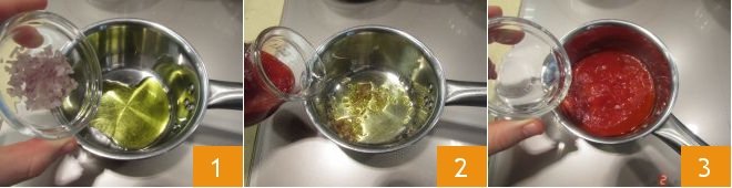 To prepare fried paccheri start by making the sauce. Finely chop the shallot and sauté in a drizzle of oil on a medium flame 1, add the tomato puree 2 and water 3, stir and leave to cook on a low flame for around 20 minutes.