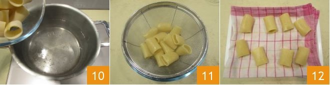 Cook the paccheri in abundant boiling water salted to taste 10 and drain them 5 minutes before the end of the cooking time 11. Drain, place them on a clean cloth and leave to dry 12.
