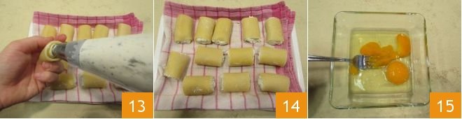 In the meantime place the ricotta cheese mix in a pastry bag and use it to fill your paccheri 13. Once you have filled all the paccheri 14, prepare the breadcrumb coating. Beat the eggs in a bowl 15.