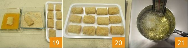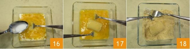 Add the salt, the milk, and beat some more 16. Now dip each pacchero in the egg 17 and then in the breadcrumbs 18.
