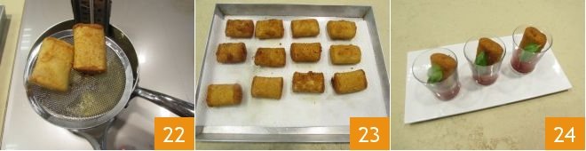 Fry for a couple of minutes until nice and golden 22. Drain the excess oil and place them on some absorbent paper 23. Serve your fried paccheri nice and hot. Place them in a glass with a little tomato sauce on the bottom and garnish with a basil leaf.