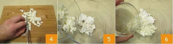 Prepare the filling in the meantime. Finely chop the mozzarella 4 and place it in a bowl, together with the ricotta cheese 5. Now add the salt, pepper and grated pecorino cheese 6.