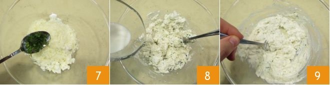 Roughly chop the basil and add to the ricotta cheese mixture 7, then add the milk 8 and stir thoroughly with a spoon to mix all the ingredients together 9.
