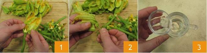 To prepare fritters with sciurilli, clean the blossoms by detaching the bud from the stem, opening the petals, and removing them from the corolla. Try to keep them intact 1. Discard the stem with the stalk and then deal with the peduncles, the small tips at the base of the bud 2. Set aside the cleaned blossoms and prepare the batter: in a pitcher with water, add the yeast 3.