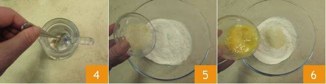 Dissolve it with the help of a teaspoon 4. Then, in a bowl, pour the flour, the Parmigiano Reggiano DOP 5, and the egg 6.