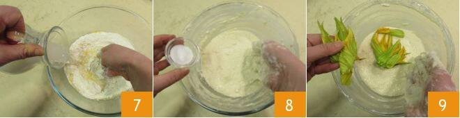 Start kneading with your hands while pouring in the water 7. As soon as the dough starts to take shape, add the salt 8. The consistency of the batter should be quite soft and viscous; while working it, literally "slap" it to incorporate air, with movements from bottom to top. Finally, add the pumpkin blossoms 9 and mix well.