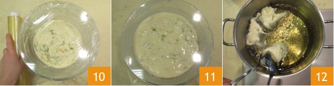 Cover the bowl with plastic wrap 10 and let it rise for at least 2 hours or until the batter has doubled in size 11. After the rising time, heat the oil to 340°F (measure it with a kitchen thermometer), then drop 4-5 spoonfuls of batter into the boiling oil and let them brown 12.