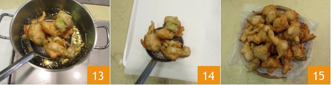 It will take about 2 minutes for them to cook evenly, turn them often to brown evenly 13, then drain on paper towels 14. Continue cooking the rest: you should get about 40 fritters with these quantities. Your fritters with sciurilli are ready: serve them very hot with a pinch of salt 15!