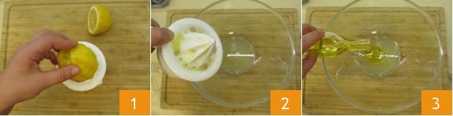To prepare your fruit salad, start by squeezing a lemon 1 and pouring the juice into a large bowl 2. Add the oil 3 and a pinch of salt.