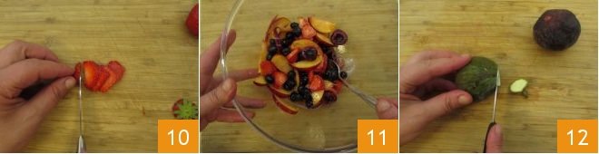 Put the nectarine in the bowl and stir 7; the lemon juice will prevent it from oxidizing. Cut the cherries in half and remove the stones 8, then pour them into the bowl, add the blueberries 9, and stir again.