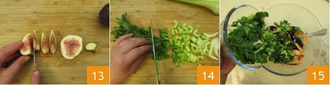 Then, without peeling them, cut them into wedges 13 and add them to the bowl before stirring gently once again. Now for the celery: Cut away the whitest, toughest part and peel the stick with a vegetable peeler. Next, cut the stem into small slices and cut the leafy part into larger pieces 14. Add the stick and the leaves to the rest of the fruit 15.