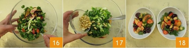 Now turn to the strawberries, removing the stalks and slicing them thinly 10. Add them to the rest of the fruit in the bowl and mix 11. Next, move on to the figs: Wash them and cut off the stalks 12.