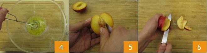 Emulsify the mixture thoroughly using a whisk 4. Next, prepare the fruit. Cut the nectarine in half and remove the stone 5, then cut into thin slices 6.