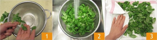 To make Genoese pesto, first remove the basil leaves from the stems and place them in a colander 1. Rinse quickly under cold running water 2, then transfer them to a dish towel and dry them by blotting and rubbing gently 3. Pay attention to the leaves’ concave shape as water can pool in them; the leaves must be nice and dry.