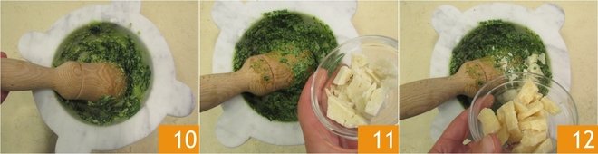 Always start with pounding movements, then moving on to circular movements 10. Make sure you scrape around the inside of the mortar with a spoon to unstick the ingredients; that way, you’ll get an even pesto. Once the consistency is creamy and even, add the pecorino 11, in chunks, and grind in the same way to incorporate it, then add the Parmigiano Reggiano 12, doing the same.