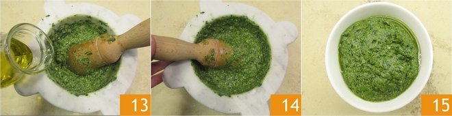 When all the ingredients have been reduced to a cream, pour in the oil 13 and circle the pestle around for a couple of more minutes 14. Your genoese pesto is ready to be used 15!