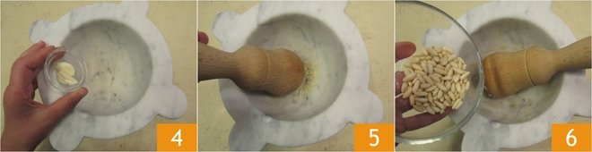 Remove the germ from the garlic cloves and cut them in half 4, then place in a marble mortar. Work the garlic with a wooden pestle until you get a cream 5. At this point, add the pine nuts 6 and continue to grind.
