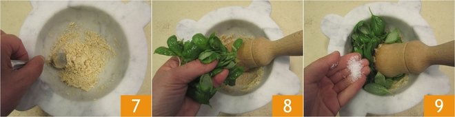 Once a paste has formed 7, add the basil leaves 8 and coarse salt 9.