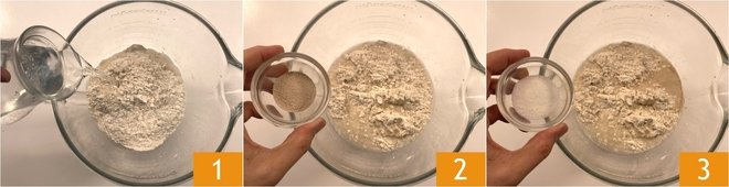 To prepare the gluten-free pizza, first pour the universal gluten-free flour mix, the water 1, the dried yeast 2, the salt, and the sugar 3 into the bowl of a stand mixer.
