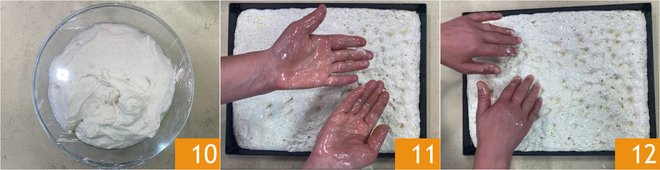 After the rising time 10, turn the dough onto a baking tray lined with parchment paper. Oil your hands slightly 11 and gently spread the dough to cover the entire surface of the tray; be careful not to use too much force, or it will tear 12. Let it rise for 45 minutes, still in the turned-off oven with the light on.