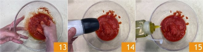 In the meantime, prepare the topping: crush the canned tomatoes with your hands 13, then season with salt 14 and 2 tablespoons of oil 15.