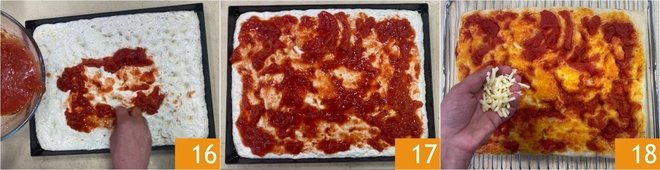 After the 45 minutes, spread the topping over the surface of the pizza 16. Bake in a preheated static oven at 430°F for 20 minutes, on the lower rack 17. Once baked, remove and transfer the pizza to the oven rack, without the parchment paper. Sprinkle the mozzarella over the tomato 18.