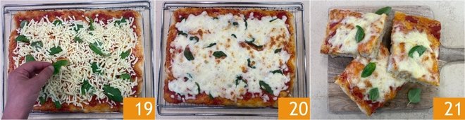 Add the basil leaves 19 and bake again for 7 minutes with the grill function at maximum power, positioning the rack in the middle-upper part of the oven. Remove from the oven 20 and enjoy your gluten-free pizza cut into slices 21!