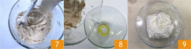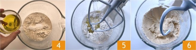 Also add the oil 4 and attach the paddle 5. Work with the mixer for 2 minutes, or until the ingredients are combined, then replace the paddle with the dough hook 6 and run the mixer on medium speed for another 2 minutes.