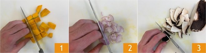 To prepare the gnocchi with pumpkin cream, mushrooms, and ricotta, clean the pumpkin and cut it into pieces 1. Clean the shallot and slice it 2. Clean the mushrooms and slice both the pleurotus and portobello 3.