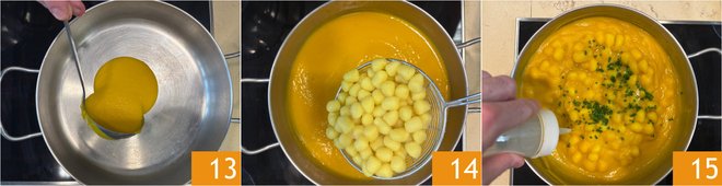 In the meantime, transfer the pumpkin cream to a pan 13. As soon as the gnocchi float to the surface, drain them into the pumpkin cream 14 and mix, then add chives and a drizzle of oil 15.