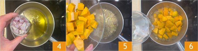 In a saucepan, brown the shallot with olive oil 4, then add the pumpkin 5 and sauté over medium heat for a few minutes. At this point, pour the water 6 and cook for 15 minutes over medium heat.