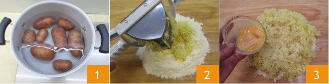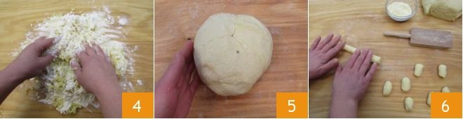 Knead by hand 4 to obtain a soft but firm dough 5. Take a part of the dough and roll it into 0.8 inch (2 cm) thick strips with your fingertips 6. In the meantime, cover the remaining dough with a cloth so that it does not dry out.