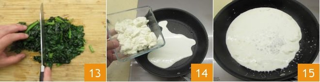 place them on a cutting board, be careful not to burn yourself; leave them to cool slightly before finely chopping them with a knife 13, then leave them to one side. Place the fresh liquid cream in the same pan you used to cook the spinach, along with the coarsely chopped stracchino cheese 14. Heat on a medium flame so that the cheese melts to form a cream 15.