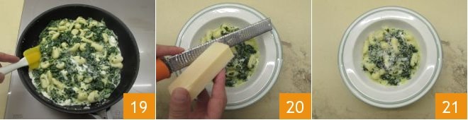 and stir delicately to flavor them 19. Serve gnocchi with stracchino cheese and spinach nice and not, add the grated Parmigiano Reggiano 20 and pepper to taste. The gnocchi are ready to be enjoyed 21!