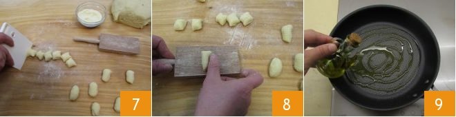 Cut the strips into slices 7, take each piece and lightly press it against a gnocchi shaper with your thumb to make the classic shape 8. If you don not have a gnocchi shaper, you can use a fork and drag it over the prongs. Leave the gnocchi to one side and start preparing the sauce Heat a drizzle of olive oil in a pan 9,