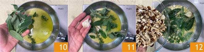 Flavor with the aromatic herbs 10 and the clove of garlic in its skin 11, then add the poplar mushrooms 12.