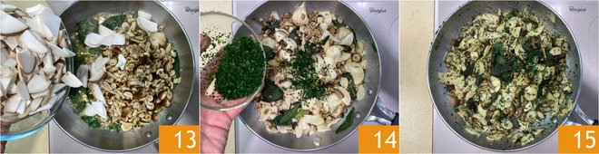 Add the king oyster mushrooms 13, salt, and season with chopped parsley 14, then cook over medium-low heat for 4-5 minutes, stirring often 15; the mushrooms should still be slightly crunchy. Once cooked, remove the garlic and set aside.