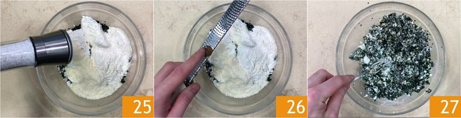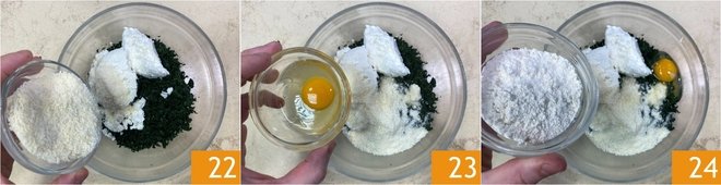 Add the grated Parmigiano Reggiano DOP 22, the egg 23, and the flour 24.