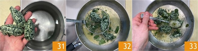 Immerse the gnudi in the gently boiling water, handling them carefully as they are very soft and delicate 31. After blanching them, gently drain the gnudi and transfer them to the pan with the seasoning 32. Let them flavor over low heat for a few minutes, basting them with the flavored butter 33.