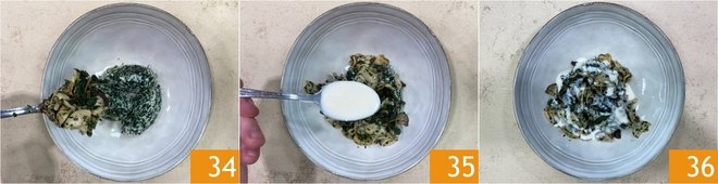 Place the gnudi on a plate, then dress with the mushrooms 34 and the fondue 35. Your black kale gnudi are ready to be served 36!