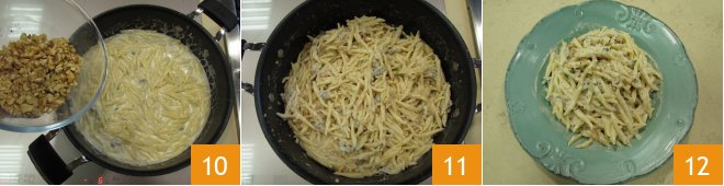 and to finish, add the chopped walnuts 10. Stir once more 11 and then your Gorgonzola and walnut pasta is ready. Serve right away 12!