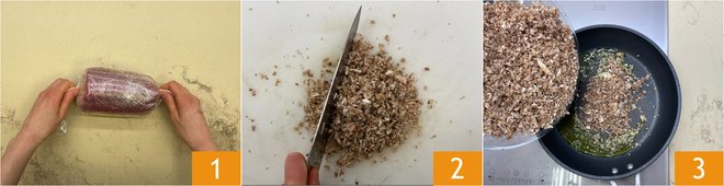 To prepare the Beef Wellington, first make the Beef Broth, being careful to salt it moderately. Remove the excess fat from the beef tenderloin, then wrap it tightly in plastic wrap 1. Let it rest in the refrigerator for 30 minutes. Meanwhile, clean the mushrooms and finely chop them with a knife 2. In a pan, heat a drizzle of oil, then add the garlic and mushrooms 3.